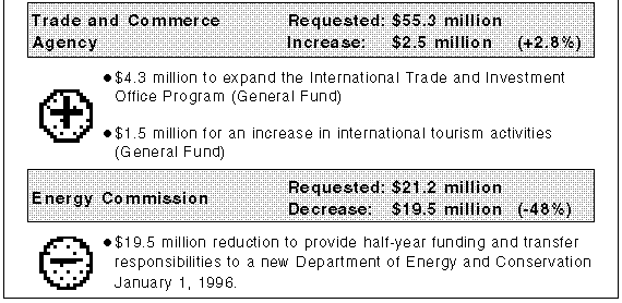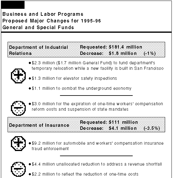 Figure 3 summarizes major budget changes proposed for business and labor programs. As shown in the figure, there are a variety of relatively small dollar increases in General Fund program expenditures. These include $5.8 million for the Trade and Commerce Agency to increase its international trade and tourism programs and $2.3 million for the Department of Industrial Relations to pay higher facility rental costs in San Francisco.