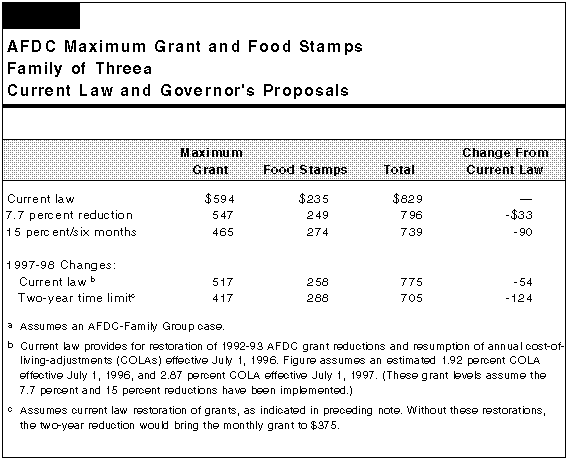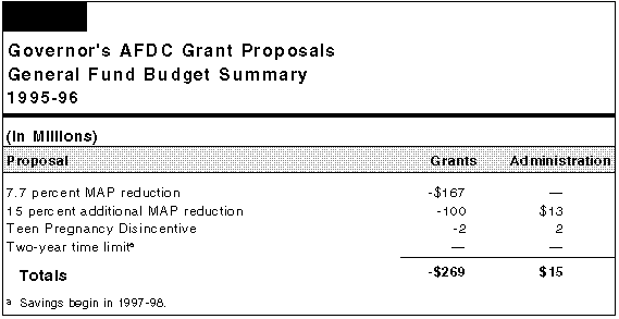 The Governor proposes legislation to make several changes that would reduce grants in the AFDC Program, for a net General Fund savings of $254 million in 1995-96. Most of these savings would result from a 7.7 percent grant reduction and an additional 15 percent reduction after six months on aid. We review the Governor's proposals and comment on them.