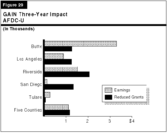 AFDC-U Participants. Figure 29 shows the impacts on earnings and reduced grants for AFDC-U participants. The earnings for AFDC-U participants were 12 percent ($1,111) higher than in the control group. Grant payments per AFDC-U program participant were 6 percent ($1,168) lower than in the control group. Again, Riverside County had greater success on balance than the other counties. (Results for AFDC-U participants in Alameda County are not included in the evaluation because of a small sample size.)