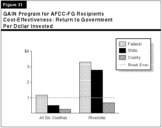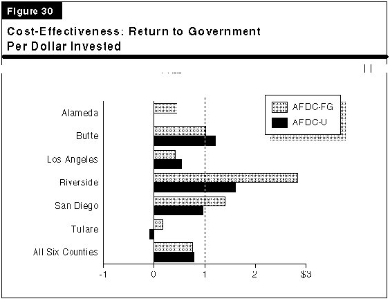 Cost-Effectiveness. Figure 30 shows the cost-effectiveness of the program for the six counties combined and individually for each county. The figure shows that overall for every dollar spent on the program, the government saved less than a dollar (as measured by lower AFDC grant payments and increased tax revenues). However, the program generated net benefits to the government in some counties, with Riverside County experiencing the highest returns ($2.84) for every dollar spent for AFDC-FG participants. The higher net benefits, particularly in Riverside, can be attributed to relatively higher earnings and higher AFDC grant savings combined with lower costs per program participant than in the other counties.
