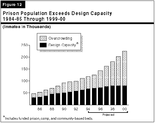 Given the current estimate of prison population growth and the scheduled completion of new prison beds, the level of prison overcrowding will worsen by 1999-2000, as shown in Figure 12.
