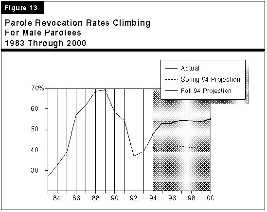 Rates Have Gone Up. In 1993-94, however, the rate began to climb again. By the first quarter of 1994-95, it reached about 55 percent. As a consequence, the CDC assumed a much higher parole violation rate in its fall 1994 projections. The CDC now projects that rate will remain at about 55 percent through the end of the decade, as shown in Figure 13.