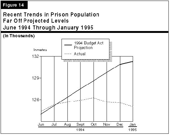 Recent Flat Population Trend Should Reduce Current-Year Costs. The prison population has essentially remained flat for several months. In fact, as of January 15, 1995, the population was 125,300 inmates--roughly the same number as of July 31, 1994. Figure 14 compares the trend in inmate population growth for 1994-95 to the levels projected last May which were the basis for the 1994 Budget Act. The Governor's Budget assumes that the state will incur General Fund savings of $7 million in the current year because population growth was less than anticipated. Given that the population is even lower in the current year than projected in the Governor's Budget, we estimate that the state will incur General Fund savings in the current year of millions to tens of millions of dollars beyond the $7 million estimate.