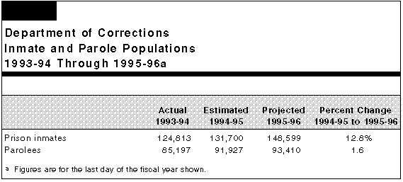 The Governor's Budget assumes that the number of prison inmates will reach 131,700 by June 30, 1995, and increase further to about 148,600 by June 30, 1996, which represents an increase of 5.5 percent in the current year and 13 percent in the budget year. The budget also assumes that the population will increase further over the following four years, reaching more than 230,000 inmates by the end of 1999-2000. This represents an average annual increase of almost 11 percent from 1994-95 through 1999-2000.