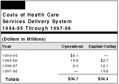 In addition to the operations costs associated with the new system, the CDC is requesting $2.7 million in capital outlay for design and plans for modifications at five prisons to meet licensing and other facilities-related requirements of the service delivery plan. In 1996-97, the CDC estimates that it will need an additional $12.1 million for capital outlay, which includes construction at five institutions and design work for a further seven institutions. In 1997-98, the CDC estimates that a final $19.6 million will be needed to complete work at seven institutions. These estimates do not include medical-related construction costs for future new prisons.