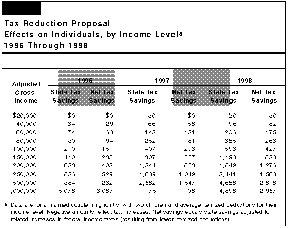 All Other Taxpayers Will Eventually Benefit. In 1996, all taxpayers with income levels under $500,000 (except those low-income taxpayers mentioned above) would receive some tax savings. By the time the proposal is fully-phased in, high-income individuals would also realize a reduction in their taxes.