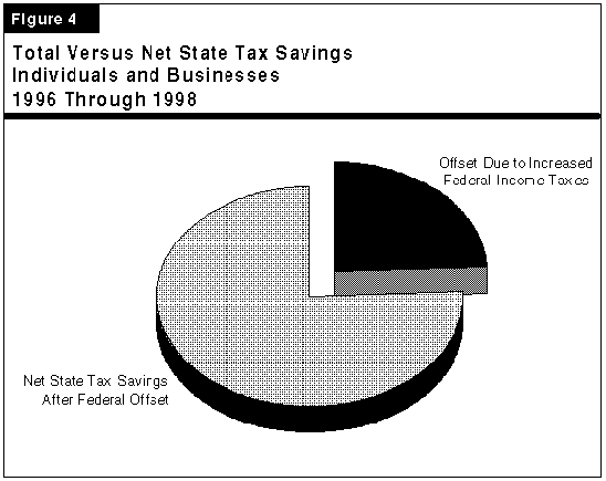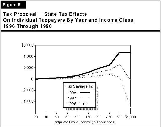 Figure 3 shows how individual taxpayers with different income levels would be affected in 1996 through 1998, as the tax proposal is phased in. For illustrative purposes, the examples used in this section are for a married couple filing jointly, with two children and tax deductions equal to the average of California taxpayers having the same income level. The figure displays both the state tax savings from the rate reduction, and the net tax savings after adjusting for higher federal income taxes. Federal income taxes are increased because, in most cases, lower state tax liabilities reduce the amount of itemized deductions a taxpayer can claim for federal income tax purposes. This is because state income taxes are an allowable itemized deduction on federal tax returns. Thus, except for high- income individuals in 1996 and 1997, the taxpayers' federal income tax increases. This federal tax increase from current-law levels is deducted from total state tax savings to arrive at the net amount. In the case of B&C taxpayers, their state taxes also are deductible, but as a business expense; thus, they also would generally see their federal taxes rise.
