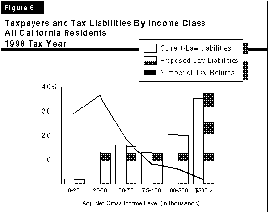 Figure 6 shows the distribution by adjusted gross income (AGI) of tax liabilities under both current and proposed law, compared to the distribution of taxpayers. It shows that taxpayers with income over $200,000 as a group would pay a larger share of total tax liabilities--about 2 percent higher under the proposal, whereas all income levels below this would experience slight drops in their shares of total tax liabilities. The figure also shows that under current law, high-income taxpayers, who represent less than one-tenth of all taxpayers, would pay almost 60 percent of the total tax burden. This proportion would increase slightly under the proposed system. Thus, the PIT structure becomes more progressive under the tax proposal because a greater share of the tax liabilities is borne by higher income individuals.