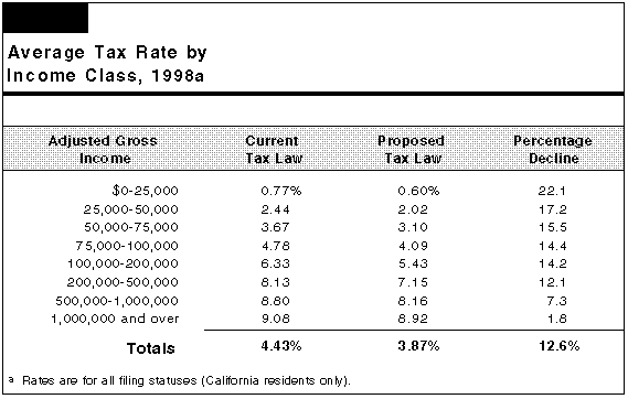 The tax proposal would produce a slightly more progressive PIT structure for California, largely due to retaining the high-income rate brackets. Under both current law and the tax proposal, taxpayers with higher levels of income bear a proportion ately greater share of total tax liabilities than do lower-income taxpayers. Under the proposal, this effect increases.