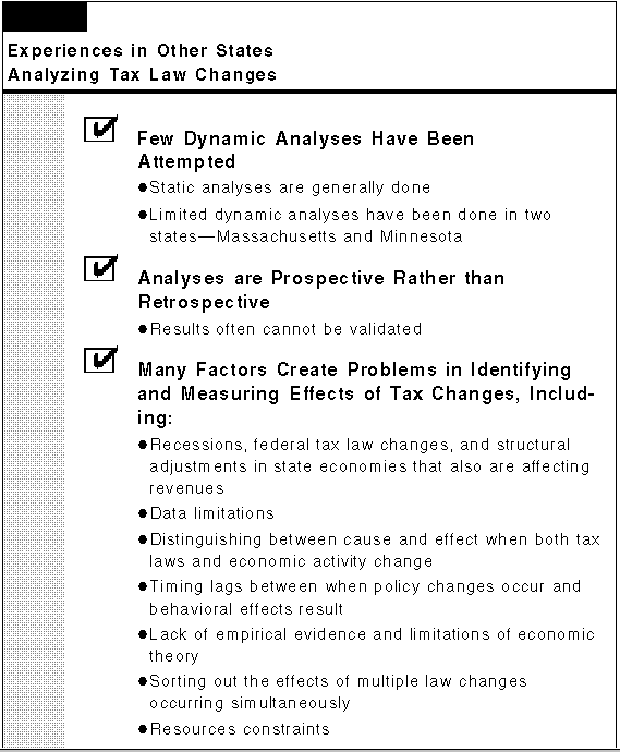 In an effort to see whether we could draw any conclusions about what the dynamic feedbacks of the Governor's tax proposal might be, we conducted a review of what 25 other states had seen happen when they made major changes to state taxes in the past. Figure 16 summarizes what other states told us were their experiences with major tax law changes in the past 15 years. The bottom line is that little is known regarding dynamic feedback effects. Of those states that have attempted to conduct dynamic analyses, only Massachusetts has completed more than a few. And, even in this case, validating the results of this work and other static analyses is often difficult because states do not conduct retrospective analyses. (A retrospective analysis looks back at tax law changes and measures what their effects actually were.) While states are interested in discerning the dynamic feedback effects of tax law changes, many factors (including those in Figure 16) have precluded them from doing so.