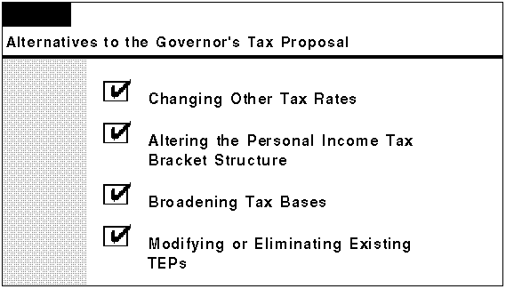 Thus, the Governor's tax proposal is but one of many options for changing the existing tax structure and providing for a tax reduction that changes the tax burden. In evaluating the Governor's tax proposal, or any alternative proposals, the Legisla ture will need to first decide what its fundamental tax policy objectives are, and then what types of tax changes, if any, are needed to best achieve these objectives. The fiscal and distributional consequences should be examined to ensure that they are consistent with legislative objectives, such as the desired mix of public versus private spending in the state.