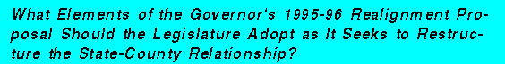 The 1995-96 Governor's Budget contains a proposal for restructuring the relationship between county governments and the state. Borrowing significantly from the approach used in the 1991 state-county program realignment, this proposal increases county shares of cost in existing social services programs, and balances most of these increased costs with (1) increased revenues transferred to counties from the state and (2) increased state share-of-cost in other programs.