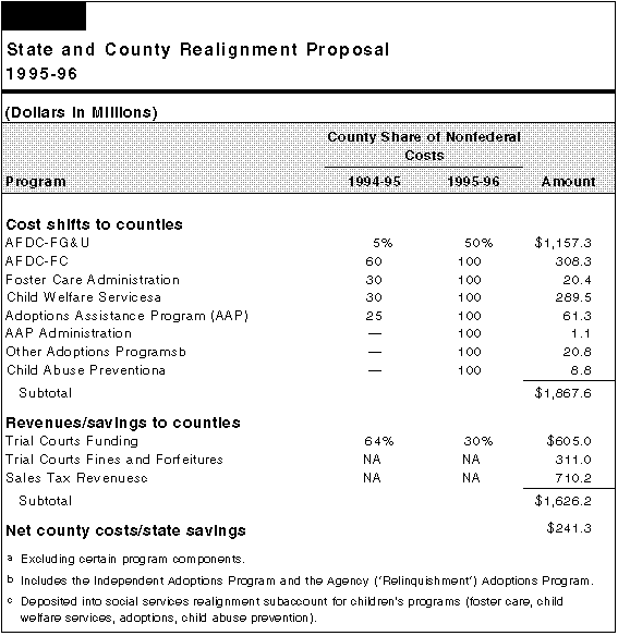 The 1995-96 Governor's Budget includes a realignment proposal which would increase county funding responsibility for the Aid to Families with Dependent Children (AFDC) Program and for several children's services programs. Most of the additional county costs would be offset by increasing the state share of the trial court program and by a transfer of sales tax and trial court revenues to the counties.