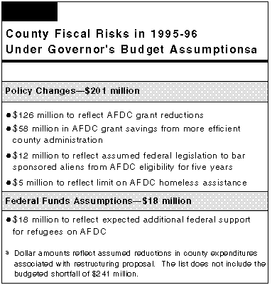 Figure 2 summarizes the fiscal impact of the budget's assumptions on county costs in 1995-96. Because it is unlikely that all of the savings from policy changes and federal actions will be realized, the proposal's assertion of a $241 million gap is a tenuous one, and the actual gap represented by the restructuring proposal could be much larger.