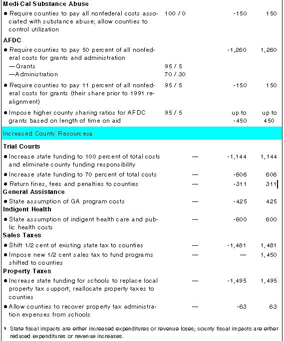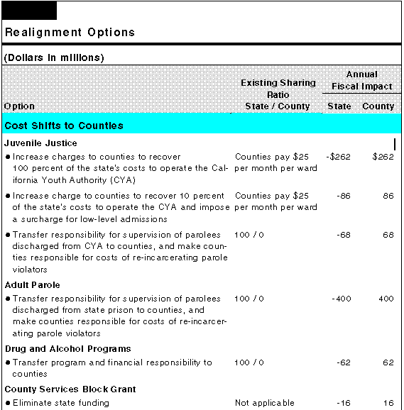 At the outset, the Legislature should recognize that the Governor s proposal is but one of many different courses of action it could choose to begin the process of restructuring the state-local relationship. The Legislature s own realignment task force last year considered many of these options, and although it took no action, its work identified a wide range of programs and approaches under which an initial step towards its restructuring goals could be taken. Figure 3 identifies the programs that have been considered in the realignment context over the last two years, along with the 1995-96 fiscal impact of these changes on the state and the counties.
