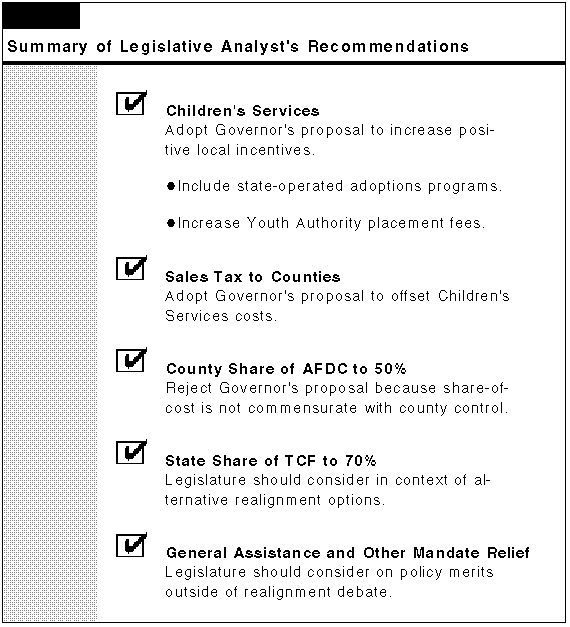 In our view, however, as a short-term or initial step towards making the longer term changes that are needed in the relationship between the state and all units of local government, the proposal is seriously flawed. This is because, taken as a whole, it exacerbates budgetary pressures on county governments while giving the counties few tools with which to control costs and guide local destinies. One portion of the proposal, however, relating to the realignment of children s services programs, does have considerable merit and we believe that it should be seriously considered. In addition, we believe that the Legislature should consider alternative approaches to the proposed AFDC-Trial Court Funding program swap, and that the issue of mandate relief should be considered on its merits outside of the general debate on the issue of program realignment. Our recommendations are summarized in Figure 4 and are discussed in more detail in the remainder of this analysis.
