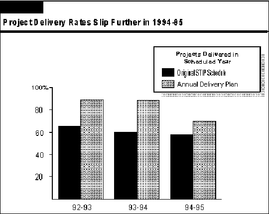 Because Caltrans and the CTC make changes to the STIP schedule, to add, reschedule, or delete projects, Figure 15 also shows delivery against Caltrans' annual project delivery plan. The delivery plan includes all projects identified for delivery in a given year, without regard to the date when the projects were originally scheduled in the STIP. Figure 15 reveals that in 1994-95 Caltrans delivered 70 percent of the projects in the 1994-95 delivery plan, down from 89 percent delivery in 1993-94.