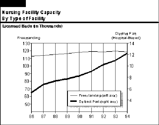 Nursing Facilities.As Figure 17 shows, the number of distinct part (hospital-based) nursing facility beds has more than doubled since 1986, increasing from about 5,000 licensed beds in 1986 to over 12,000 beds in 1994. In contrast, the number of freestanding nursing facility beds has remained fairly steady, increasing by about 1 percent annually over the eight-year period. In other words, hospital-based nursing facility capacity has grown at over ten times the rate of freestanding facilities.