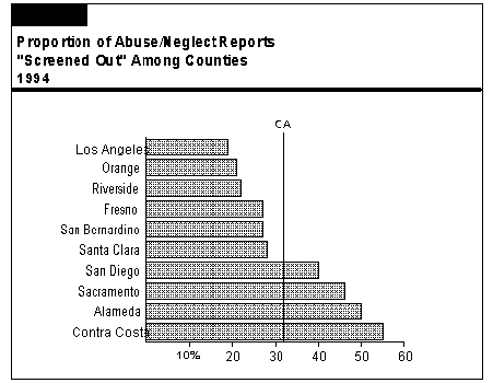 Significant Variation Among Counties in Percentage of Reports "Screened Out." One of the functions of the CWS Program is to respond to reports of child abuse and neglect. Counties are required to screen, by use of telephone assessments, reports of child abuse/neglect to determine whether an in-person investigation is necessary. Ideally, only those reports that do not constitute abuse or neglect are "screened out" in the initial response stage. As Figure 34 shows, there is significant variation among the counties in the percentage of reports that are "screened out." Without further investigation, we cannot determine whether some counties are screening out too many or not enough reports of abuse/neglect. We believe this is an area that warrants investigation by the department.