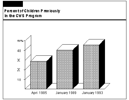Recidivism Increasing. As shown in figure 35 (see next page), the percentage of children returning to the CWS Program has increased significantly over the years, from 29 percent in 1985 to 46 percent in 1993. These data suggest that the program has not been effective in preventing reabuse and neglect in a significant and growing number of cases. The increased recidivism may be partly due to changes in the CWS caseload, such as an increase in the number of families who are more difficult to serve effectively (for example, a higher proportion of cases where children have severe behavioral problems or parents who have substance abuse problems). Currently, there is a lack of information identifying those factors which contribute to the success of family maintenance and reunification services. If these services are working well we would expect to see recidivism mitigated. We believe that collecting such performance data could ultimately improve program outcomes.