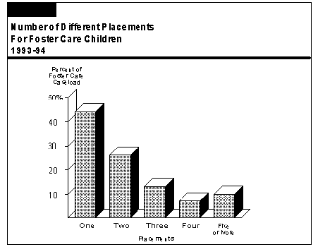 Multiple Foster Care Placements. Another measure of the success of the CWS Program is the extent to which multiple foster care placements for the same child are minimized. The data show that in 1993-94, about one-third of children in foster care had experienced three or more different placements. (See Figure 36.) We note that Chapter 1294, Statutes of 1989 (SB 370, Presley) requires the department to develop a Level of Care Assessment tool to facilitate the assignment of a foster care child to the most appropriate placement, thereby reducing the chances of multiple placements. Although there is no statutory completion date, the department has not provided the Legislature with a project status report which was due in January 1995. We find no justification for the delay in completing this project.