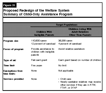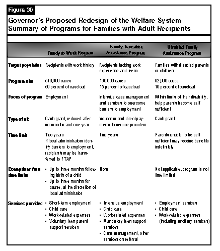 Key Program Changes. Figure 29 (see next page) compares the existing AFDC Programs to the Governor's proposal. The new program includes the following major changes: