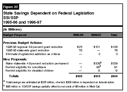 Budget Savings Contingent on Federal Welfare Reform. Figure 32 (see next page) lists past and proposed budget actions that are dependent on federal legislation. As the figure shows, $614 million in General Fund savings in the current and budget years are at risk. With the exception of the elimination of drug and alcohol addiction as qualifying disabilities (which is included in separate pending legislation), the most recent version of federal welfare reform (passed by Congress but vetoed by the President) would enable the state to implement the proposals shown in Figure 32. We note however, that the budget assumes that the current-year grant reductions will become effective April 1, 1996. Because of recipient notification and other administrative requirements, it will not be possible to achieve all of the savings assumed in the budget for the current year even if federal welfare reform is enacted in March 1996.