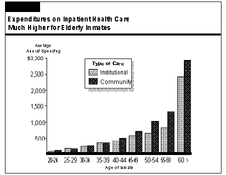 Estimating the Extra Cost of Aging Inmates.Estimates vary as to exactly how much more costly these older inmates will be. Based upon a review of inmate medical-care usage data, and recognizing that estimating these costs is difficult because of inadequate information, we estimate that aging inmates annually cost the prison system an average of $46,869--or more than double the typical cost for an inmate. Of this total, the additional medical and related security costs associated with aging inmates are $24,984. Our figures were derived from historical hospital care cost and usage data provided by the CDC and budget data for inpatient and outpatient care. Figure 15 depicts how much more costly it is to provide inpatient care for aging inmates both at prison hospitals and community hospitals outside of prison. The figure does not include outpatient care and health-related security costs.