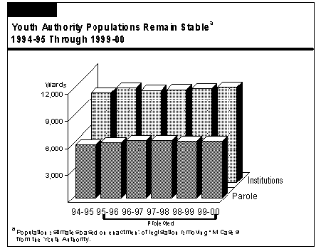 The Youth Authority also projects little change in the number of parolees it supervises. Figure 18 shows the Youth Authority's institutional and parolee populations from 1994-95 through 1999-2000.