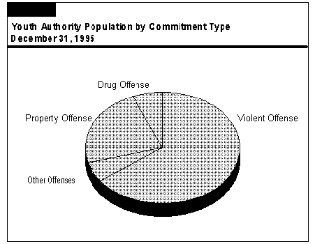 Most Wards Committed for Violent Offenses. In 1995, 65 percent of the wards housed in departmental institutions were committed for a violent offense, such as homicide, robbery, and assault. In contrast, only 42 percent of the CDC's population has been incarcerated for violent offenses. The number of wards incarcerated for property offenses, such as burglary and auto theft, was 22 percent of the total population. The number of wards incarcerated for drug offenses was just under 7 percent in 1995. Figure 19 shows the population of the Youth Authority by type of offense.