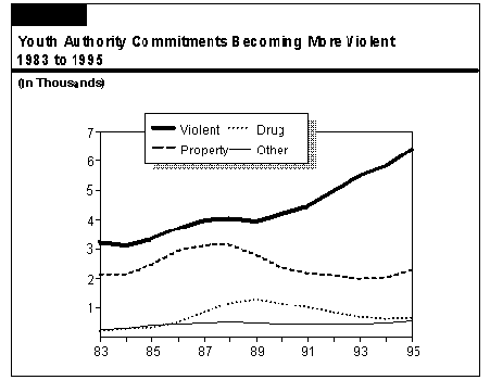 Violent Offender Population Has Increased. The Youth Authority has seen substantial increases in its violent offender population. Since 1983, the institutional population of violent offenders has increased almost 50 percent, or at an average annual rate of over 5 percent. On December 31, 1995, the Youth Authority housed 1,288 murderers, or about 13 percent of the total institutional population. Of these wards, about 78 percent were committed by juvenile courts. The remaining 22 percent had been sentenced in criminal court. Figure 20 shows the trends in offender populations at the Youth Authority.