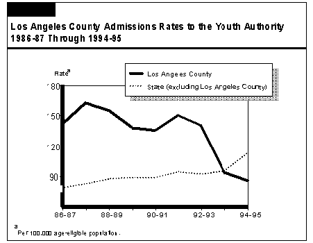 In contrast, only 6 percent of Los Angeles' juvenile offenders are placed in the Youth Authority. In fact, the level of new admissions from Los Angeles has declined in recent years, as shown in Figure 23. For 1994-95, Los Angeles' admission rate was 24 percent less than the rest of the state.