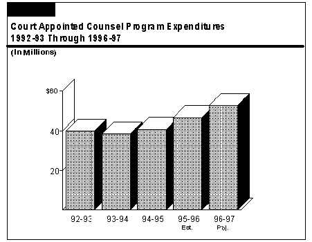 Court-Appointed Counsel Should Be Financial Responsibility of Counties.Counties are generally responsible for providing counsel for indigent defendants. Currently, the services of the county public defender's office are supplemented by the Court-Appointed Counsel Program in the courts. When the public defender's office is unavailable to take on cases, the court appoints counsel through this program to defend indigents. Actual statewide expenditures for this program were $42.4 million in 1994-95 and are projected to be $38 million in 1996-97.