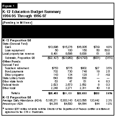 | Figure 1 K-12 Education Budget Summary 1994-95 Through 1996-97 (Funding in Millions) |