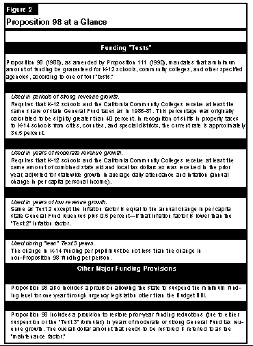 | Proposition 98 also includes a provision allowing the state to suspend the minimum funding level for one year through urgency legislation other than the Budget Bill. |