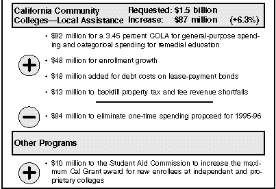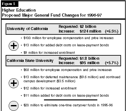 For the University of California (UC) and the California State University (CSU), the budget proposes General Fund increases of $124.1 million (6.5 percent) and $95.5 million (5.7 percent), respectively. (The CSU figure understates actual budget-year growth, because 1995-96 expenditures include $20 million in one-time spending.)