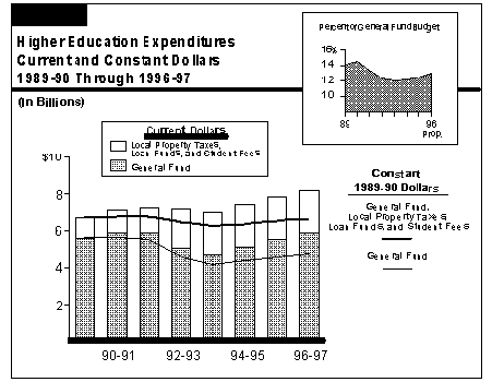 Figure 1 (see next page) shows that higher education expenditures from the General Fund have increased by $275 million since 1989-90, representing an average annual increase of 0.7 percent. When these expenditures are adjusted for inflation, General Fund spending decreased over this time period by an average of 2.2 percent annually.
