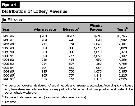 The act provides that lottery proceeds are to be distributed annually as follows: 50 percent of lottery revenue returned to the public in the form of winnings, at least34 percent made available for public education, and no more than 16 percent for administrative costs. Figure 4 (see page 16) shows the distribution of these funds since 1985-86. It indicates that lottery revenues reached a high of $2.6 billion in 1988-89 and a low of about $1.4 billion in 1991-92. The commission estimates annual revenues of about $2.2 billion in the current and budget years, an increase of 2.7 percent from 1994-95. The allocation to education in those two years is based on the required 34 percent minimum level.