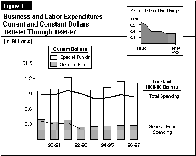 Figure 1 (see next page) shows that expenditures for business and labor programs from all state funds reached about $1.2 billion in 1991-92, then declined through 1993-94. Over the eight-year period shown in Figure 1, expenditures increased by $163 million, representing an annual average growth of 2.8 percent. When these totals are adjusted for inflation, spending declined by about 4.9 percent over the total period, or slightly less than 1 percent annually. The General Fund share of program expenditures has declined from 41 percent in 1989-90 to 24 percent in the budget year.