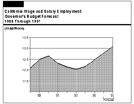 The Department of Finance's (DOF's) economic forecast assumes that both the U.S. and California economies will expand at a moderate rate with low inflation over the next two years. As indicated in Figure 2, the budget projects that California will have recouped the 725,000 jobs lost in the recent recession by mid-1996, and that the state will have 13 million jobs by the end of next year. Economic growth in the state will be led by international trade, high technology industries, tourism, and entertainment-related activities. The administration forecasts that homebuilding will experience a modest rebound, due to continued projected job growth and low interest rates.