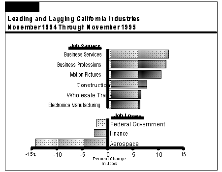In contrast to the slowing national economic trend, the California economy accelerated in 1995. The state added over 340,000 jobs during the past year, with almost every major industry experiencing increases. As indicated in Figure 1, the fastest-growing economic sectors were business services and professions, motion pictures, construction, wholesale trade, and electronics manufacturing industries.
