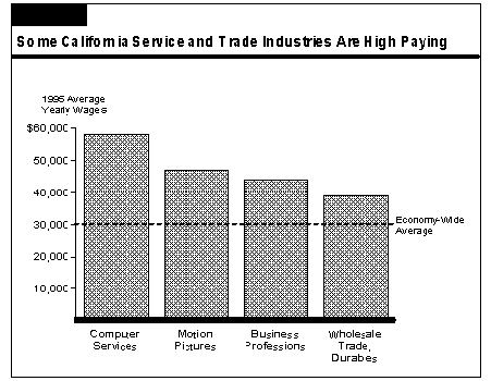 Nevertheless, it is true that an encouraging number of high-paying jobs are being created in California--even in the trade and services sectors. As indicated in Figure 2 (see page 20) computer services (which is a subcomponent of the business services category shown in Figure 1) has an average yearly wage of $58,000, nearly double the economy-wide average. Motion pictures, professional services, and wholesale trade also are high-paying sectors.