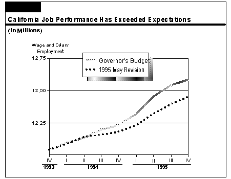 California's economic performance in 1995 was significantly stronger than expected by most forecasters. For example, Figure 3 shows that the employment gains in the past year have far surpassed those expected in the May Revision forecast, which itself was slightly above the consensus view of economists at that time. The recent employment increases have been particularly encouraging in view of the lack of a meaningful recovery in the state's real estate industry last year, where homebuilding remained near historic lows and home prices continued to decline in many regions of the state.