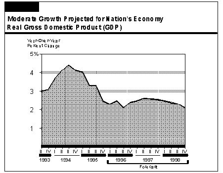 The Department of Finance's national economic forecast reflects the consensus view of private economists as of year-end 1995. It assumes that, after slowing sharply in the fourth quarter of 1995, the national economy will settle into a trend of moderate growth and low inflation during the next two years. The department specifically forecasts that real GDP will increase by 2.5 percent in 1996 and 2.6 percent in 1997, a modest slowing from the 3.3 percent growth experienced in 1995. Unemployment is projected to trend slightly upward to around 6 percent by 1997, as labor force growth slightly exceeds the pace of job growth. Both inflation and interest rates are projected to remain relatively low.