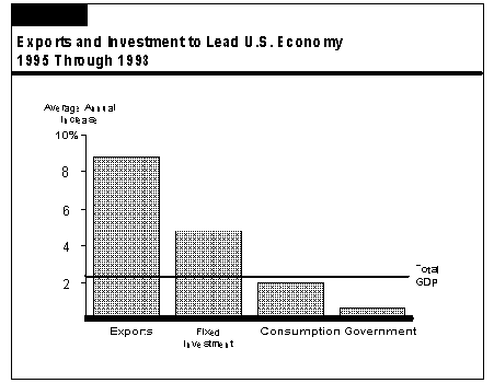 Figure 8 indicates that other positive factors in the outlook include rising demand for U.S. exports, which will be bolstered by an improvement in the economies of our major trading partners, and a continuation in the growth of business fixed investment spending (which includes business purchases of computers and other equipment, as well as new construction spending). Slower growing sections include consumer spending, which is being constrained by high debt levels, and federal government purchases, reflecting ongoing efforts to reduce the federal deficit.