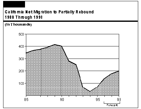 We project that California's population will grow at an average annual rate of about 1.6 percent over the next three years, from 32.6 million in 1995 to 34.1 million by 1998. This projected increase is up significantly from the 1.3 percent average growth experienced during the 1992 though 1994 period. The key reason for the acceleration is an anticipated increase in net migration from other states and countries. As shown in Figure 10, total net migration into California fell sharply during the state's recent recession, reflecting net out-migration of people