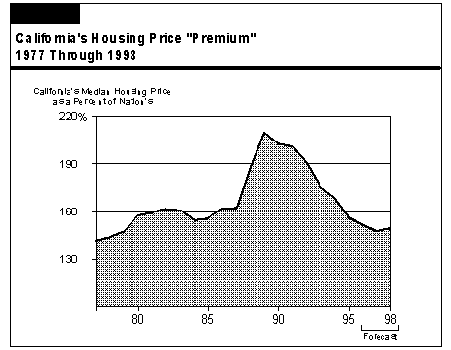 Figure 12 provides a broad perspective regarding California home prices by comparing them to the nation's during the past two decades. The figure shows that in the mid-1970s, the median price of a California home was about 40 percent above the national median. This home-price margin jumped in the late 1970s, stabilized in the early 1980s, but increased sharply again during late 1980s. At the end of California's speculative real estate boom in 1991, the median home price was about $205,000, which was about double the nation's.