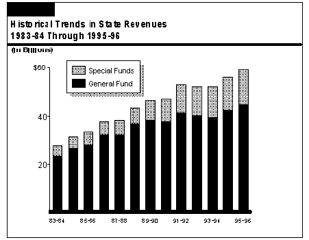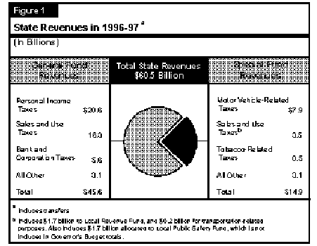 Figure 1 (see page 34) shows that, of the $60 billion-plus in state revenues projected in the budget for 1996-97, about three-fourths are General Fund revenues while the remaining one-fourth are special fund revenues. These estimates include the effects of the Governor's tax reduction proposal, as well as other revenue-related budget assumptions.