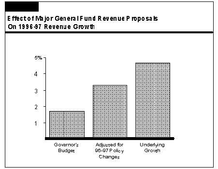 Budget Proposals. The low 1.3 percent growth in General Fund revenues is partly due to the tax reduction and trial court proposals included in the budget (discussed below), which together will lower General Fund tax receipts by $883 million in 1996-97. Figure 5 shows that after adjusting for these policy changes, the underlying budget-year revenue growth would be a bit higher--3.3 percent. This is a modest improvement but still relatively low, given the moderate growth pace projected for the California economy.