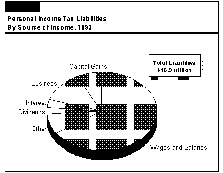 Figure 7 shows that about two-thirds of total PIT liabilities are related to wages and salaries paid to individuals. The next-largest share is business-related earnings, including the income of partnerships and sole proprietors. The remainder is from interest, dividends, capital gains, and other smaller sources.